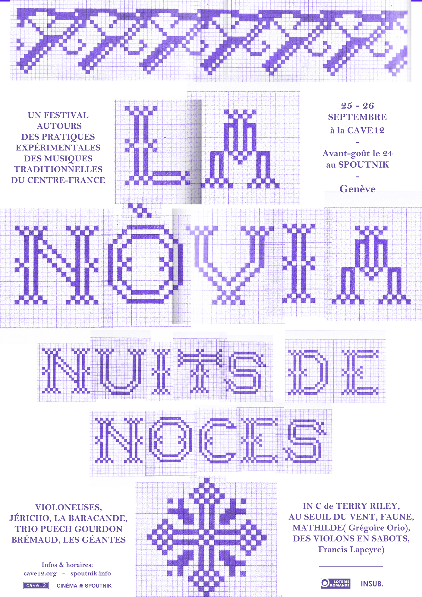 Le samedi, la grande nuit / traversée avec les groupes cultes du collectif, VIOLONEUSES, fragilité acoustiques, LA BARACANDE, chansons sombres sur fortes doses de bourdons, JÉRICHO, chants épiques doubles et obsessionnelles, PUECH GOURDON BRÉMAUD, musique (de bal) psychédélique intemporelle, LES GÉANTES, collages électroacoustiques de traditions élargies.